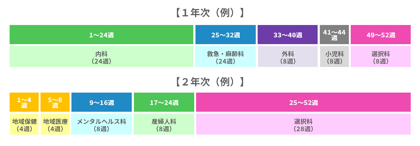 2年間で計36週の選択期間があり、比較的自由度の高いローテーションプログラムを作成することが可能です。また、1年目同士が同一診療科をローテーションしないよう配慮しており、1人あたりの症例や手技が一定数以上確保できるようにしています。